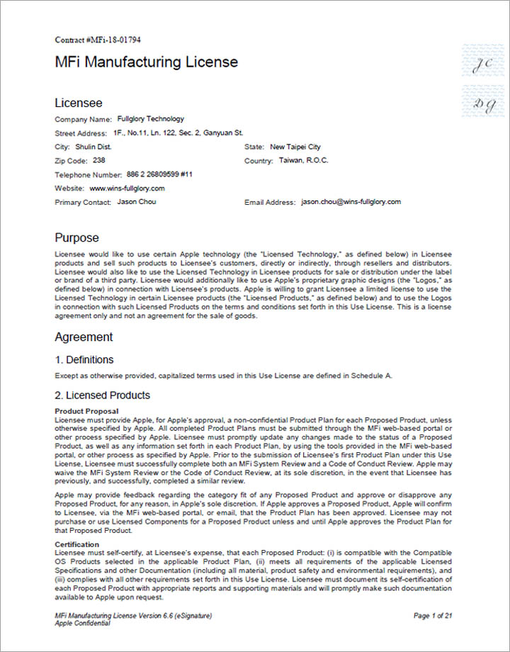 褔軒科技於2013年5月取得APPLE MFi 6.1版量產等級認證。